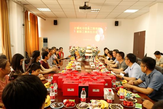 为增加我院教职工的幸福感和归属感,增进教职工之间的感情,7月10日上午,计算机与信息工程学院在学院103会议室举办5、6、7月教职工集体生日会。学院领导与5、6、7月的寿星老师们欢聚一堂,共同庆生。生日会由学院工会主席、副院长陈艳浩主持。